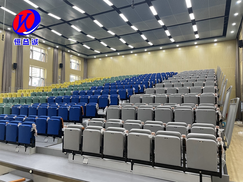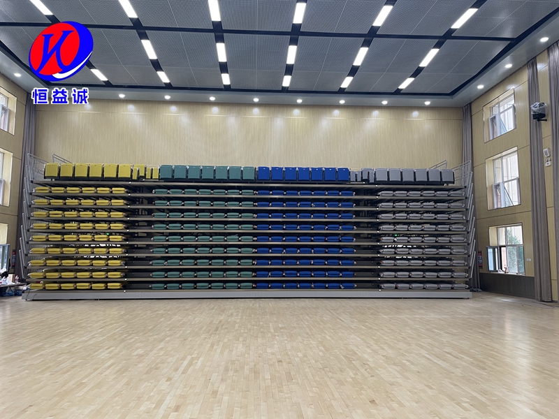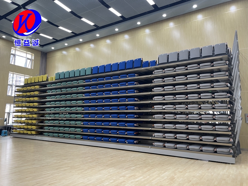 -行走机构:电动伸缩看台行走机构配有机械反馈式同步机构,能有效控制看台在伸缩过程中的定向跑偏现象,行走轮采用双轴承聚氨酯轮,具有能承受重压、不磨损地板、不开裂、滚动顺畅等特点。